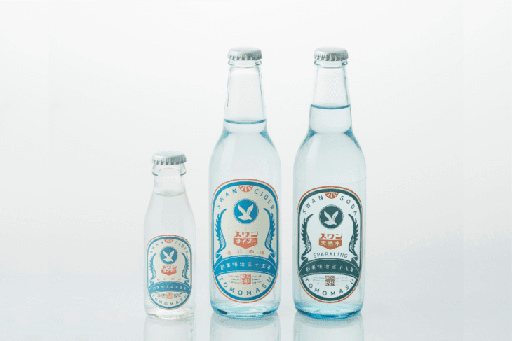 友桝飲料で愛され続けていた「スワンサイダー」の復刻版。グラニュー糖を丹念に溶かしこみ、昔ながらの製法で作っています。さらにルーツとなる「スワンラムネ」が登場。昭和初期のスワンマークやデザインを取り入れつつも、現代にあった新しい形で甦らせています。女の子たちに「カワイイ」と褒めてもらえるのが、ちょっぴり自慢だったりします。